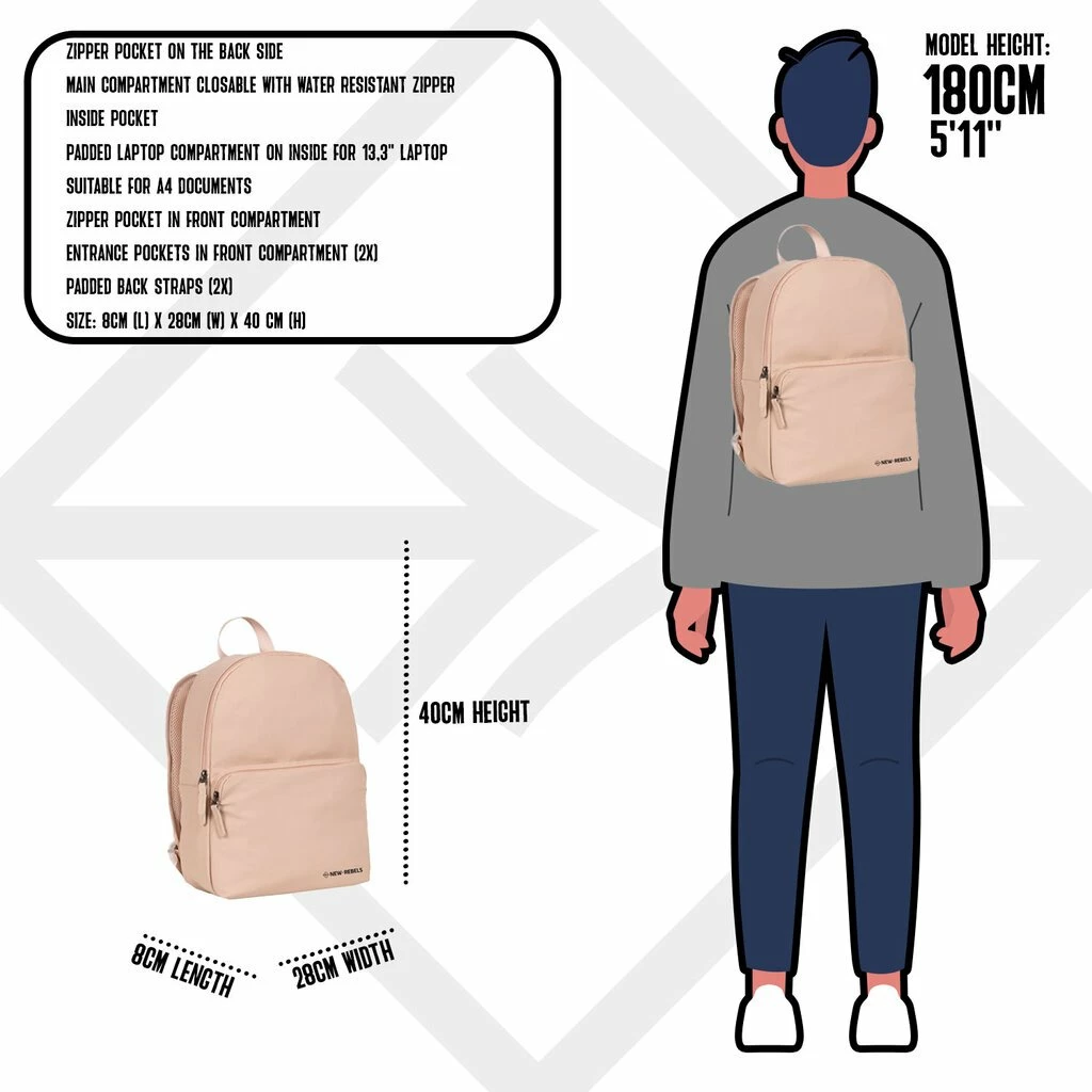 Deze waterafstotende rugzak uit de Harper serie van New Rebels. De tas is gemaakt van waterproof PU materiaal wat de tas waterbestendig maakt ook ideaal voor de wintersport of als laptoprugzak voor op de fiets. De rugzak beschikt over een ruim hoofdvak die afsluitbaar is met een waterkerende ritssluiting. In het hoofdvak met ritssluiting zit een ritsvak, een telefoonvak, een insteekvak en een laptopvak voor een 13″ laptop. Op de voorzijde van de tas zitten een horizontaal ritsvak en een verticaal ritsvak. In het horizontale ritsvak bevinden zich twee insteekvakken, twee pennenvakken en een ritsvak. Aan de zijkanten bevinden zich twee inteekvakken waar bijvoorbeeld een waterflesje en/of blikje in passen. De tas beschikt over 2 verstelbare rugbanden, hierdoor kan u de tas altijd op de gewenste lengte dragen. Het rugpaneel en de schouderbanden zijn gewatteerd, hierdoor draagt je de tas zeer comfortabel.