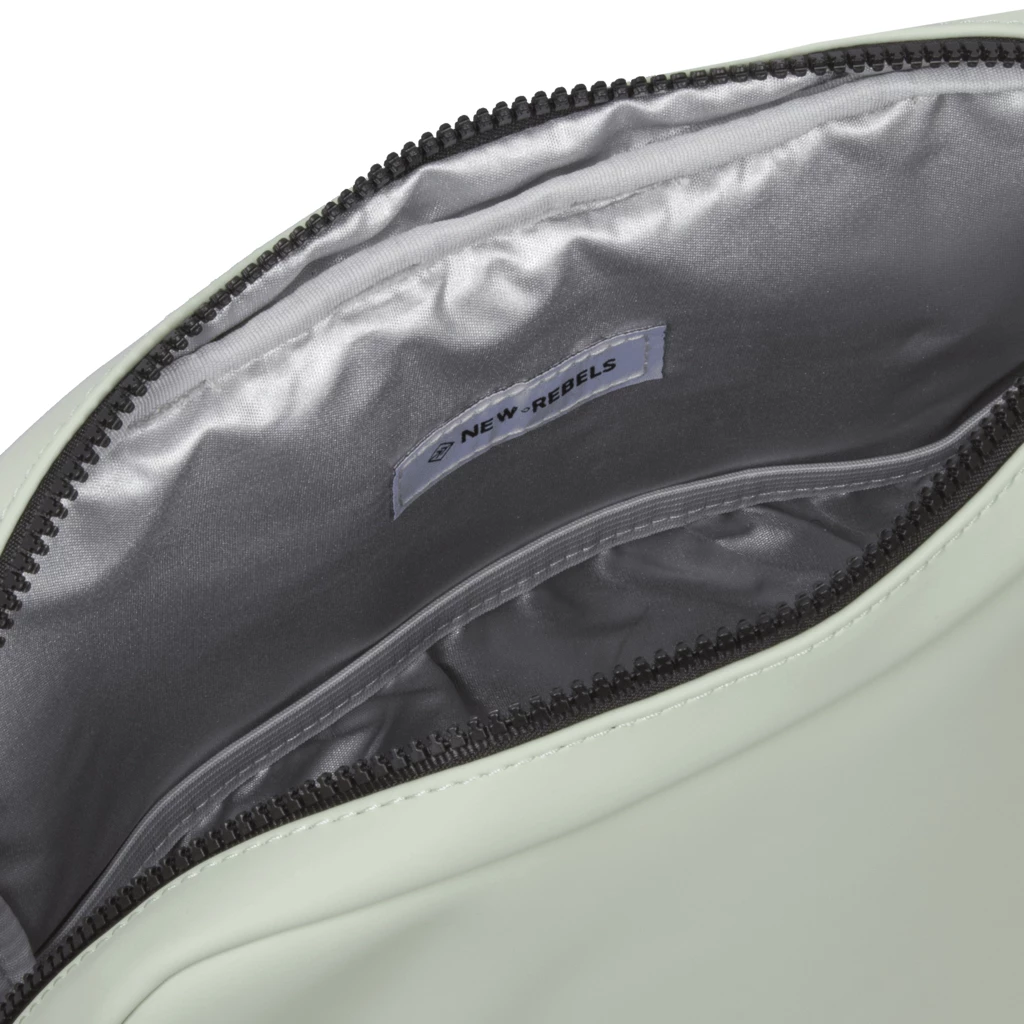 Een hoofdvak met stevige kunststof ritssluiting en zilverkleurige binnenkant met insteekvak